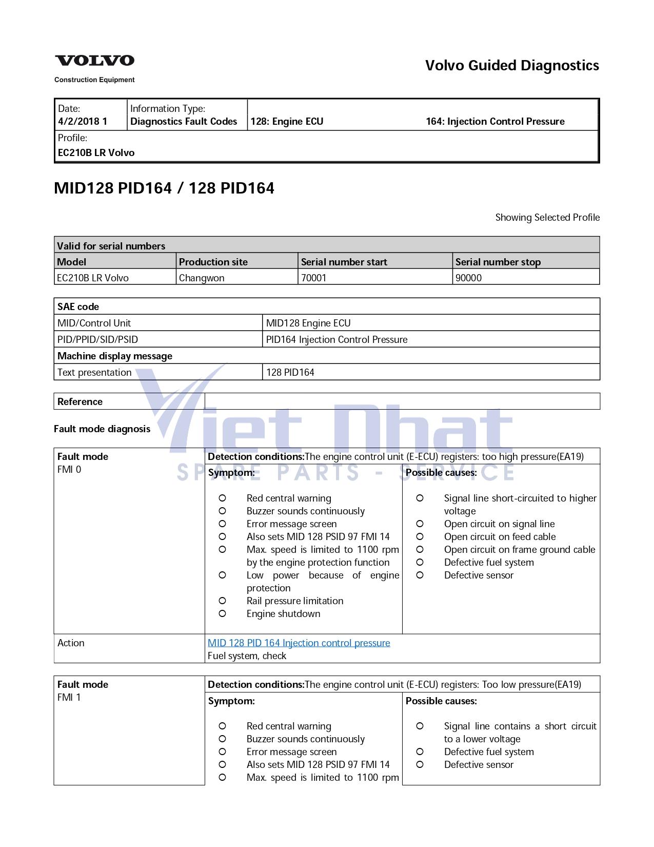 Trong các dòng máy đào Volvo EC210B LR, mã lỗi MID128 PID164 FMI4 là một trong những mã lỗi thường gặp và có ảnh hưởng nghiêm trọng tới hoạt động động cơ. Mã lỗi này liên quan trực tiếp tới áp suất điều khiển phun nhiên liệu (Injection Control Pressure) – yếu tố thiết yếu trong hệ thống phun nhiên liệu common rail áp suất cao.