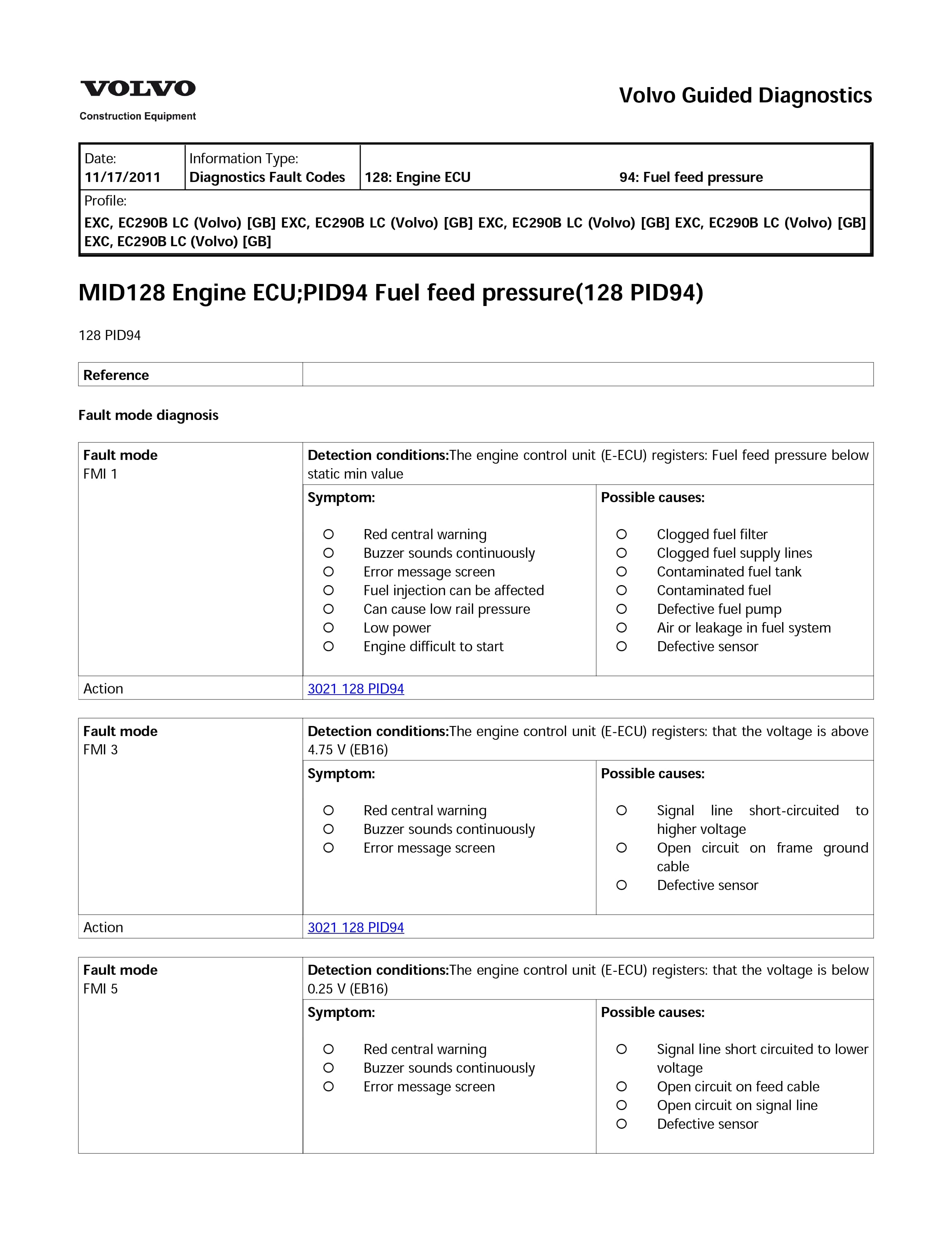 Mã lỗi 128 PID94 là lỗi hệ thống cấp nhiên liệu trên các dòng máy xúc Volvo EC290B LC, thuộc hệ thống điều khiển động cơ MID128 – trong đó PID94 đại diện cho “Fuel Feed Pressure” (áp suất cấp nhiên liệu).
