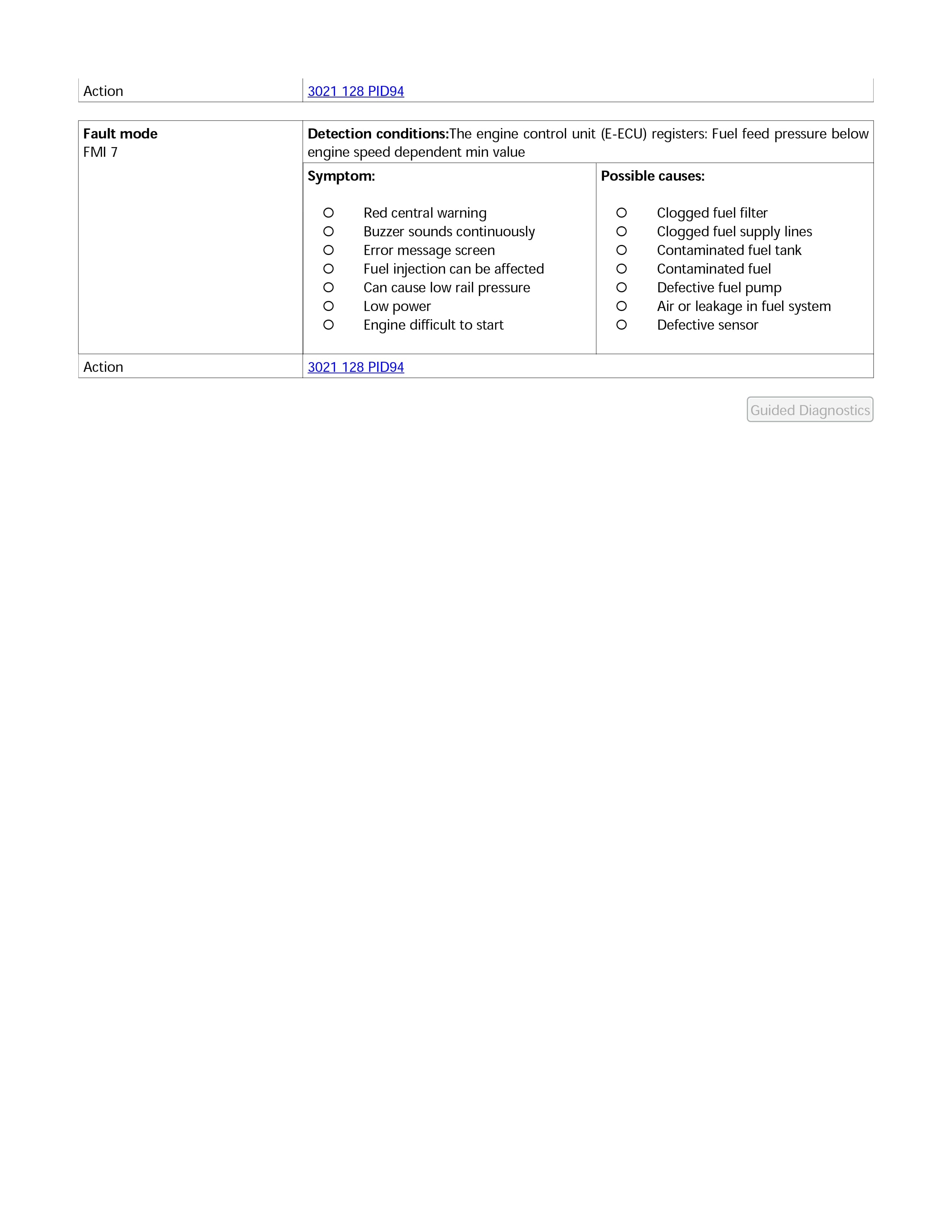 Mã lỗi 128 PID 94 là chỉ báo quan trọng cho thấy áp suất nhiên liệu đầu vào không đủ – nếu để lâu có thể ảnh hưởng tới toàn bộ hệ thống phun nhiên liệu, bơm cao áp, kim phun. Gây khó nổ trên động cơ hoặc động cơ khói nhiều, không đủ công suất hoạt động.